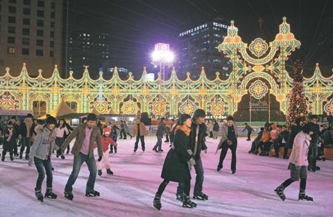 오후 7시 30분, 서울광장 스케이트장에 도착하자.