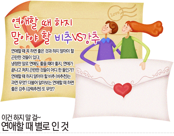 오늘은 연애할 때 하지 말아야 할 비추 VS 강추에 대해서 살펴봅니다.
